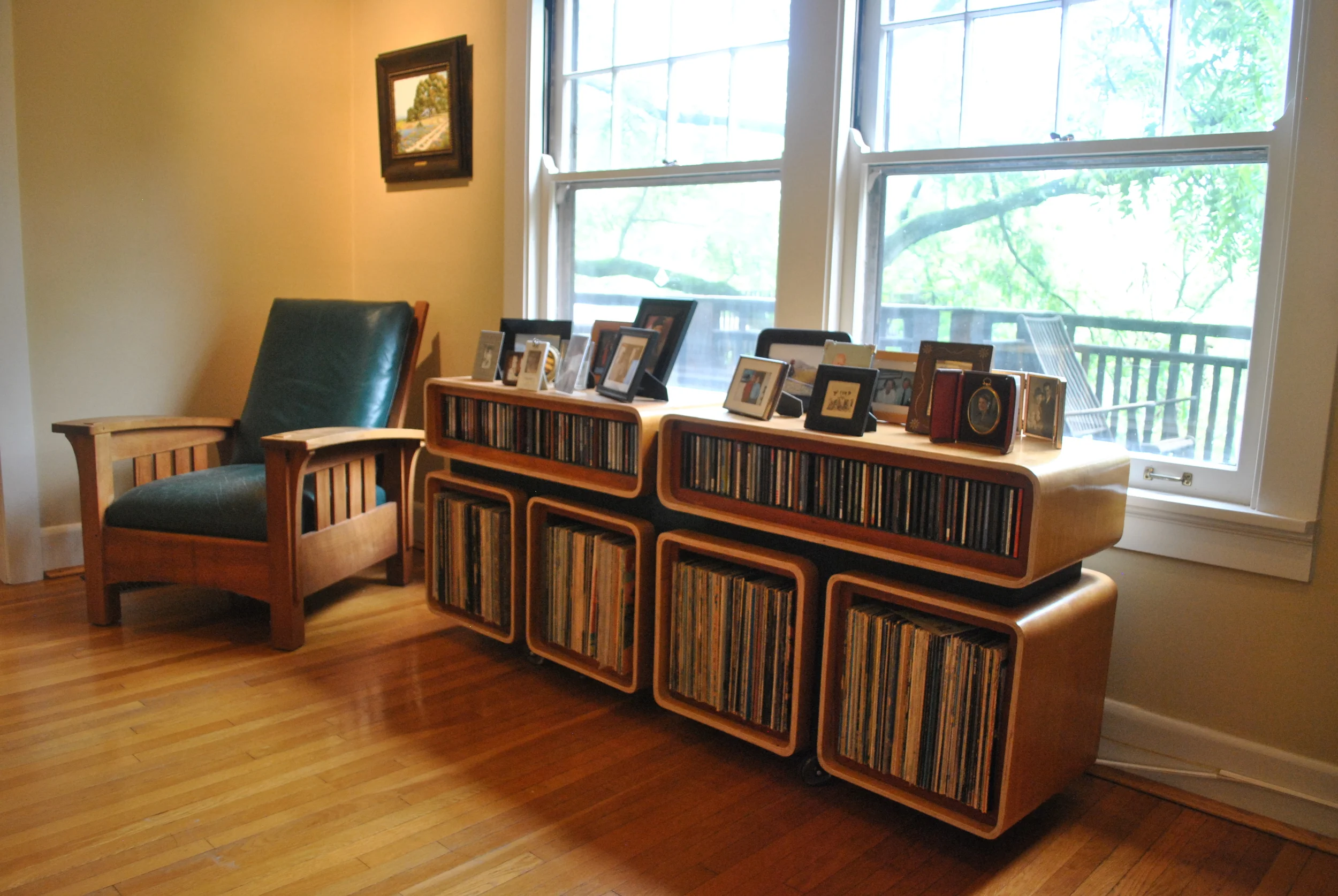 Music Machines is a suite of furnishings designed and fabricated to organize stereo equipment, records, tapes, and CDs and deliver music. The furnishings include a movable stereo equipment tambour, a record/CD tambour, a cassette tower, and two custom fabricated, ported speakers. The furnishings are made from Baltic birch plywood, cherry, 16 ounce sheet copper, neoprene 70, ebony, glass wheeled casters, and 1/8 inch bending birch plywood. The record/CD and cassette tower pieces contain sources of music and are interactive, while the stereo tambour organizes the stereo equipment that produces the music. Custom fabricated speakers deliver sound through three-way, ported speakers that rest firmly on neoprene bases.
